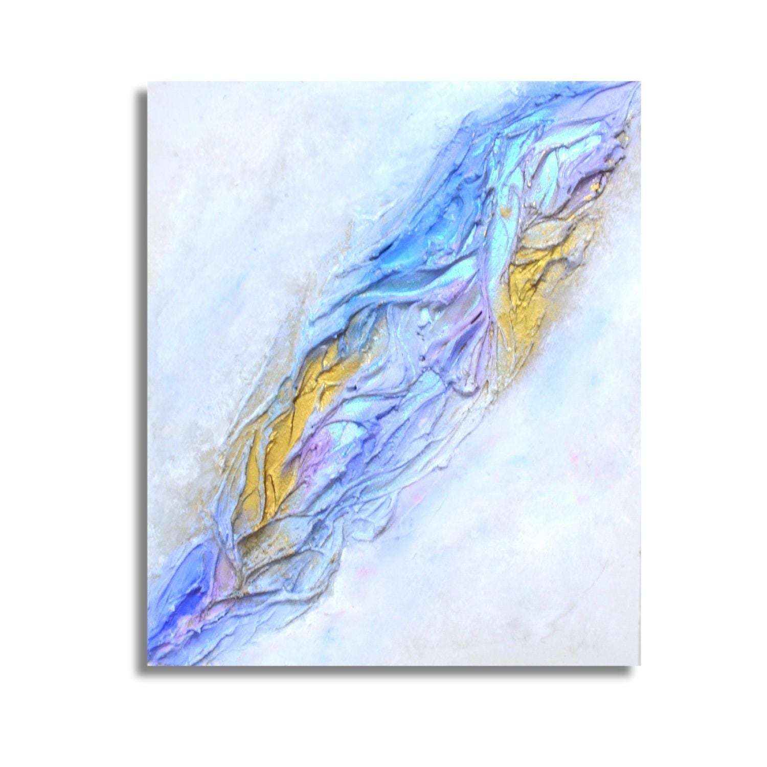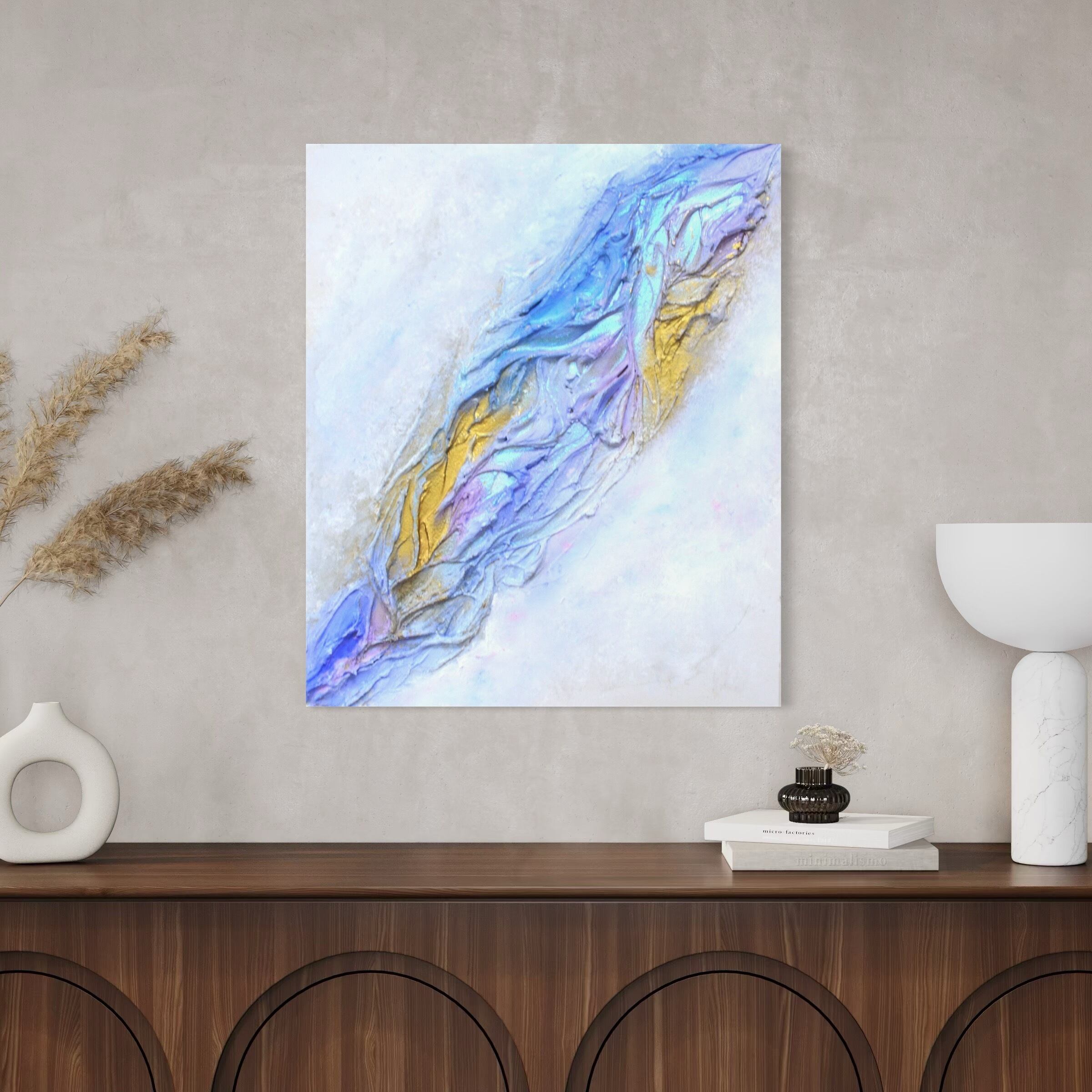 白の静寂の中に、青と紫、そして黄金がやわらかく浮かび上がります。
