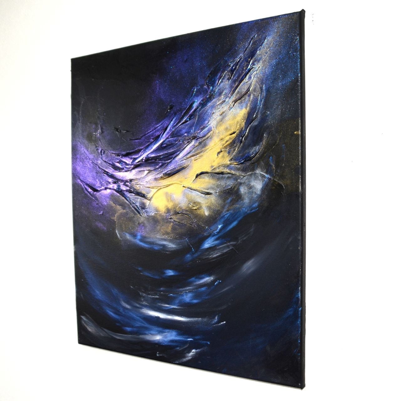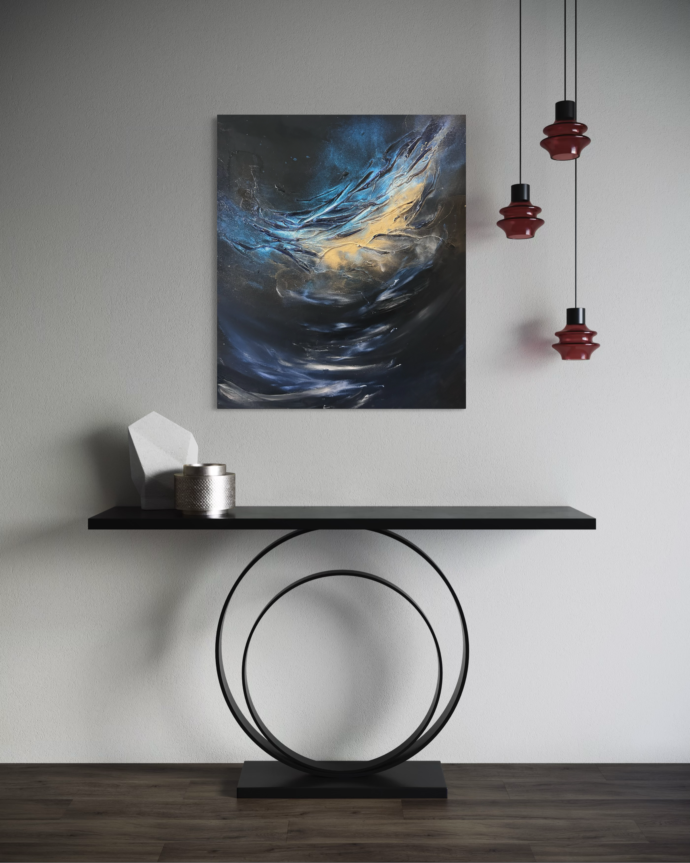 画面中央から広がる明るい色彩と動きは、その深い領域の中に現れる変化や希望の兆しを示しています。