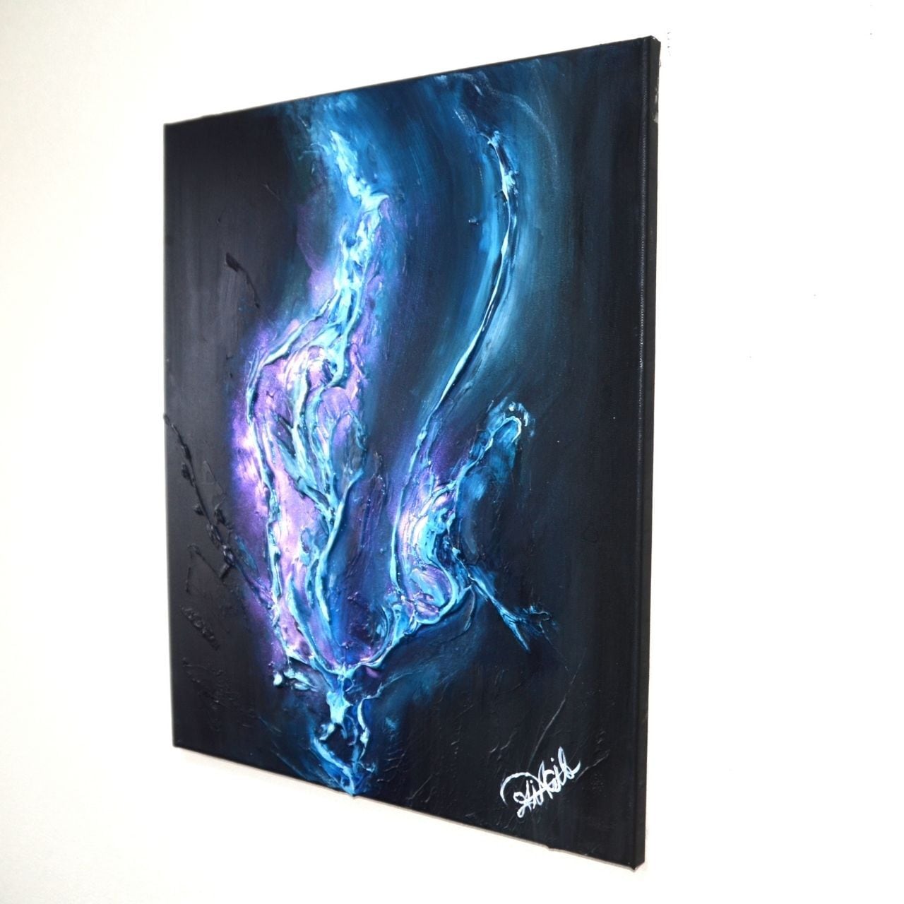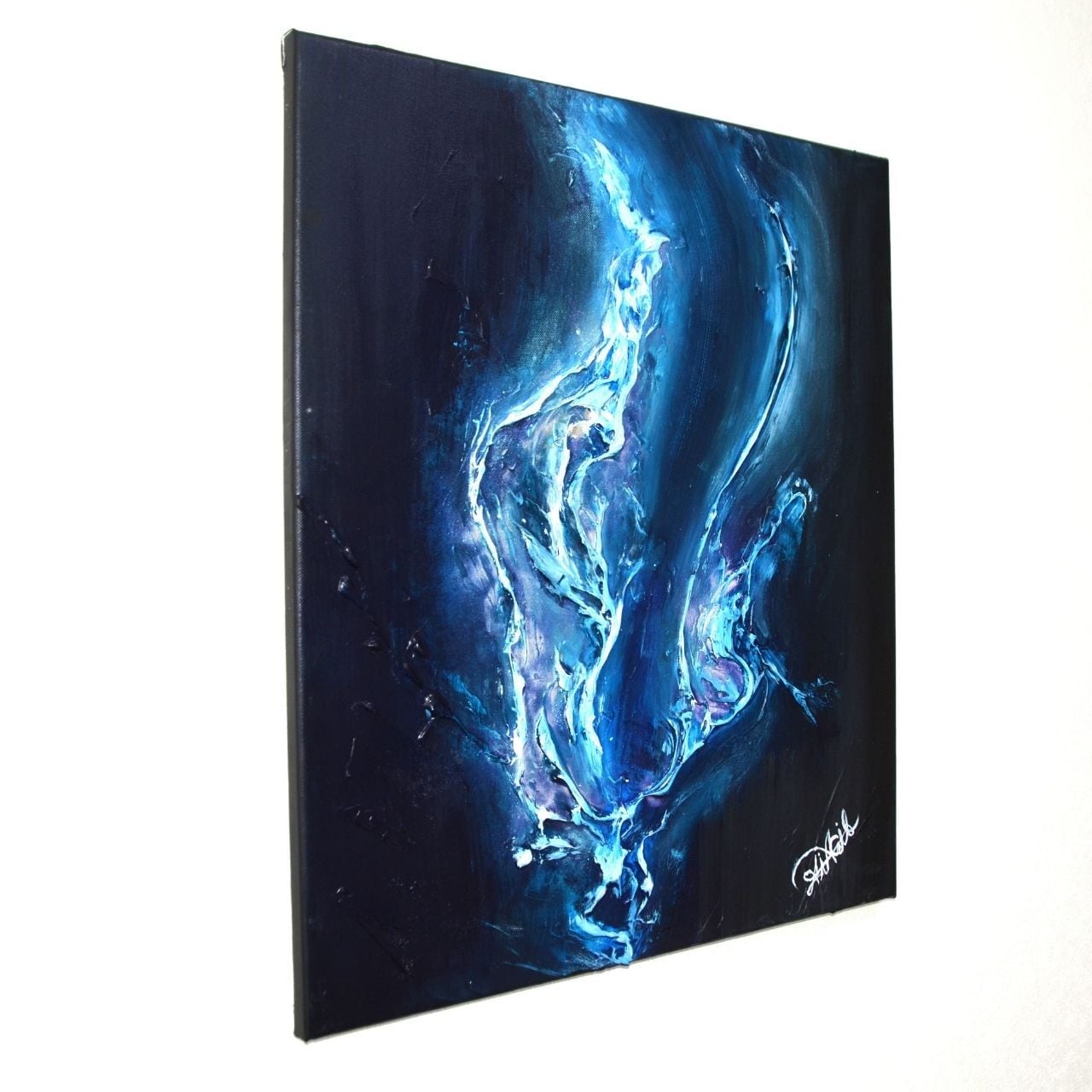 本作品には、作家本人のサインをキャンバスの側面もしくは裏面に記しています。正面の美しい印象を損なわないよう配慮しつつ、原画である証として残しています。