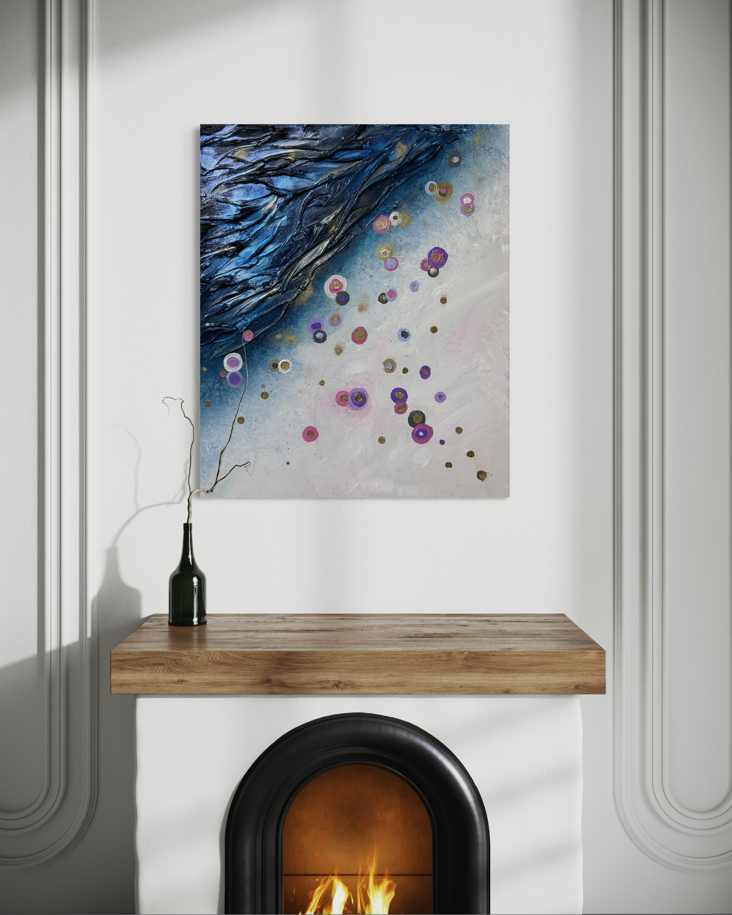 重なり合う深い青の流れは、時間や感情のうねりを思わせ、