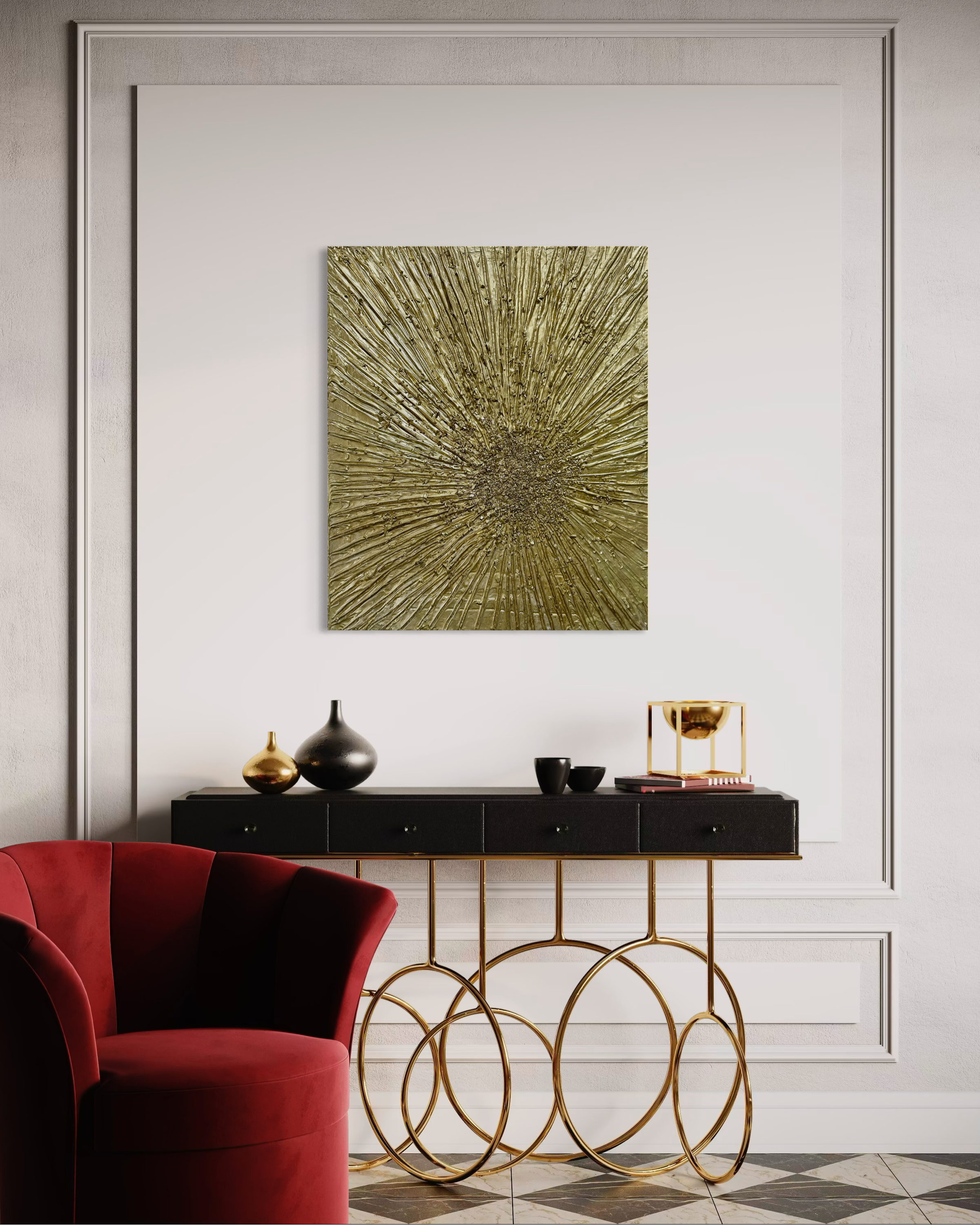 金一色で覆われた表層は、始まりが持つ純度と強度を象徴し、生成のエネルギーそのものを可視化しています。